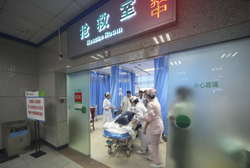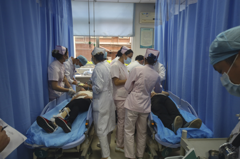 急诊科接到现场支援电话后,立即派出医疗2队,同时逐级上报。医院主管领导接到事件报告后,立即启动应急预案,召集应急领导小组成员,协调相关科室,派出相关专科人员,到急诊科集结并做好急救准备。