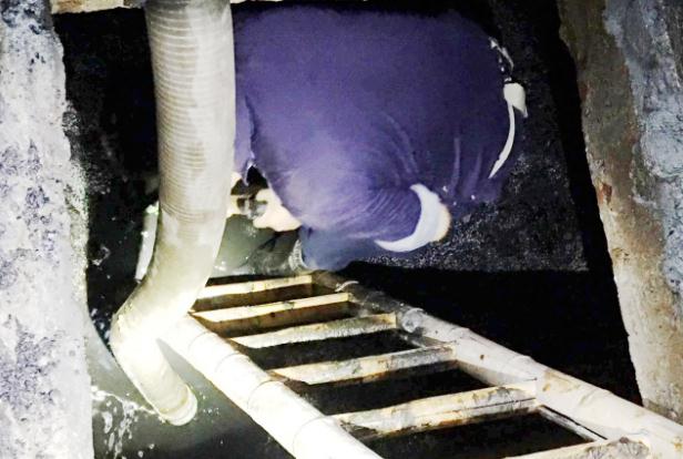 发现问题,立即排查,初步确定为沉淀池管道堵塞。在求助了两家专门处理污水维修的环保科技公司都无果的情况下,我院休假中的污水管理员们都紧急赶回了医院。经过讨论后,在保证安全、防护设备齐全的前提下,三个刚上岗几个月的新员工决定亲自下去沉淀池,尝试疏通管道。