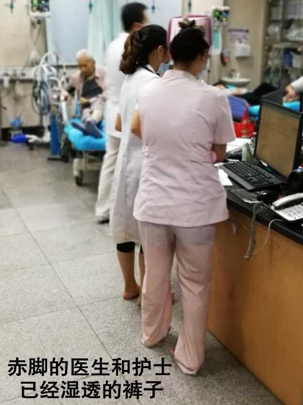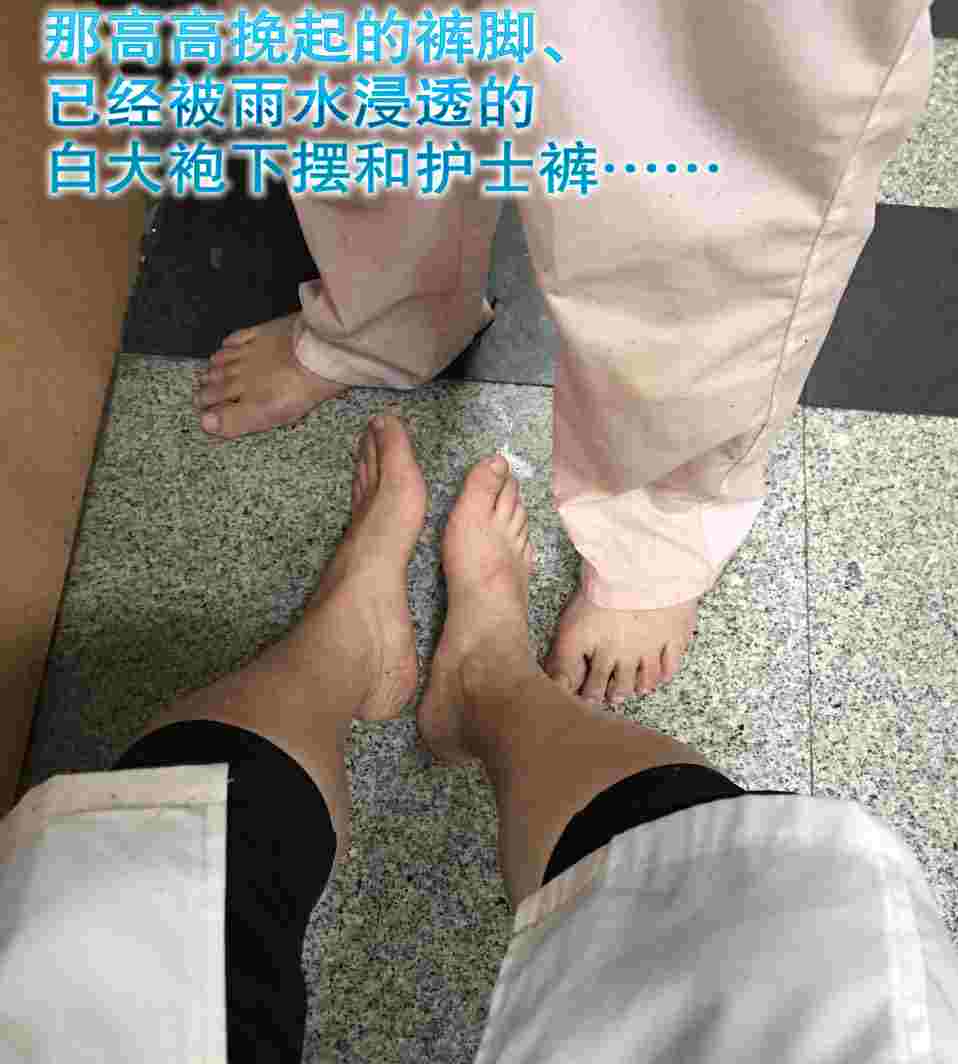 当南方医院神经内科姬医生和我院的医护人员交接完患者后,才发现我院的两位医护人员都赤脚站在抢救室的地上!那高高挽起的裤脚、已经被雨水浸透的白大袍下摆和护士裤……但是都抵不上她们脸上此时此刻透露出来的将病患安全、及时转送到达的欣慰表情……这一幕深深地感动了姬医生:“当我提出给这两位可爱可敬的青年同行拍照时,她们转身只留下了背影……”