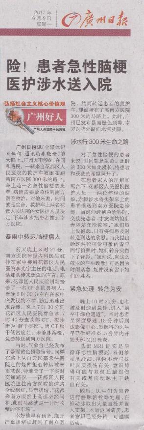 6月5日,《广州日报》刊登《险!患者急性脑梗 医护涉水送入院》