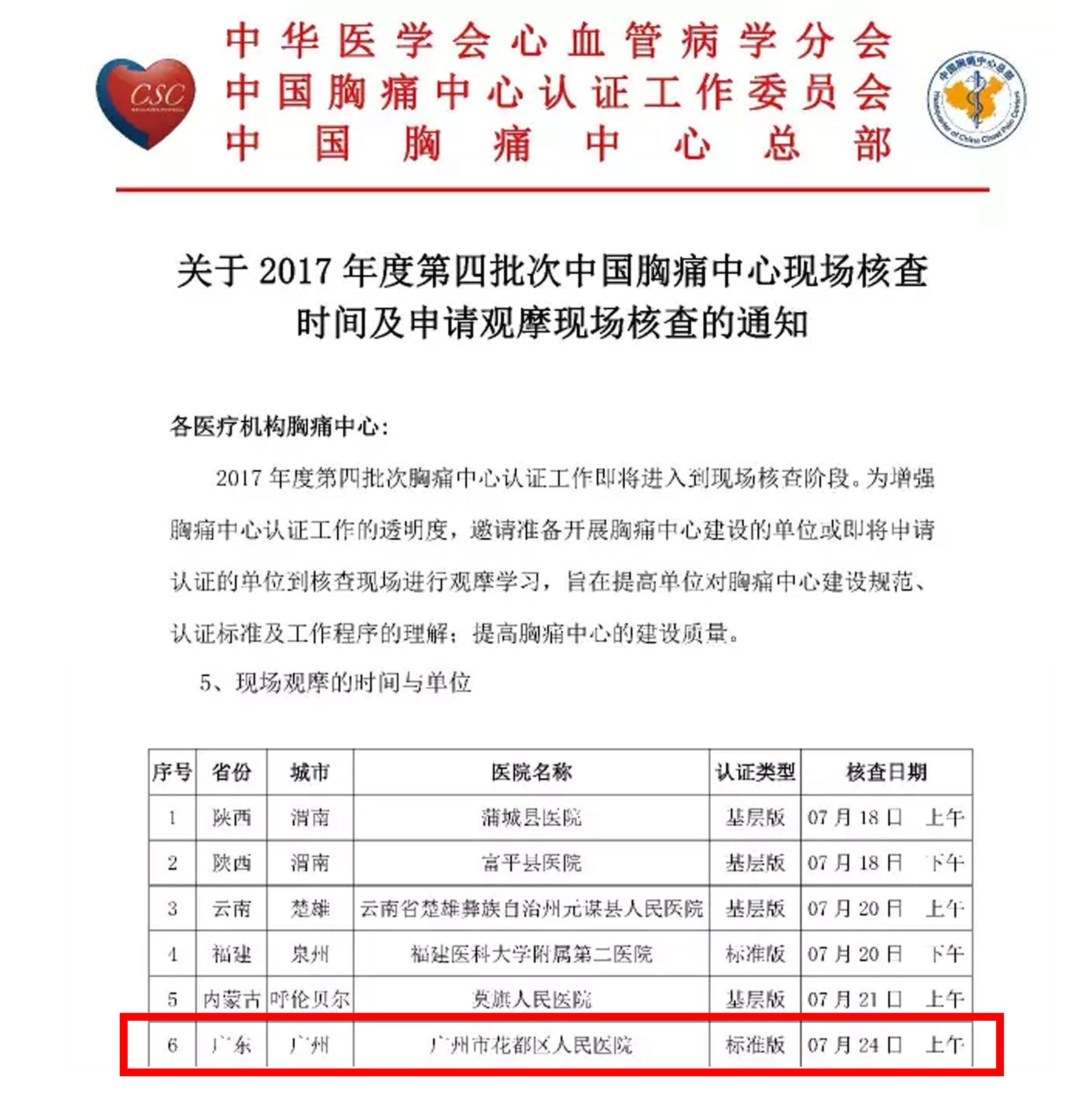 广州市花都区人民医院于2017年7月被确定为2017年度第四批次胸痛中心认证现场核查单位。