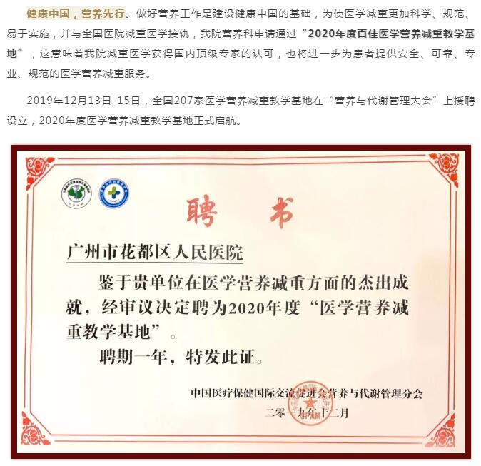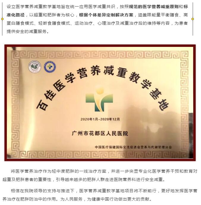 【荣誉】我院荣获“2020年度百佳医学营养减重教学基地”称号