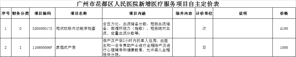 根据穗发改规字〔2018〕11号文件规定“新增医疗服务价格项目审核立项后,由医疗机构自主制定试行价格”以及粤医保规〔2020〕6号文件《广东省医疗保障局关于公布部分医疗服务价格项目的通知》等,我院拟对文件中“家庭式产房”等项目进行定价(具体见附件1:广州市花都区人民新增医院医疗服务项目一览表)。如有疑问请与财务科联系。联系电话:020-66355123