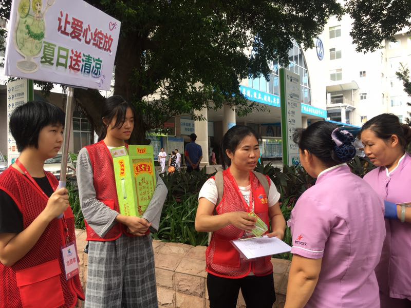 8月17日,花人医志愿者走到三个院区,给那些不畏高温酷暑、仍然坚守在生产、基建一线辛勤工作的本院户外工作者送去夏日清凉、送去人文关怀。关爱范围扩大到院外环卫工人、交警同志、城管同志、外卖快递小哥等,在三个院区沿着指定路线为高温下仍奋斗在一线的户外工作者们免费提供清凉饮料,希望能给他们送去一丝清凉。