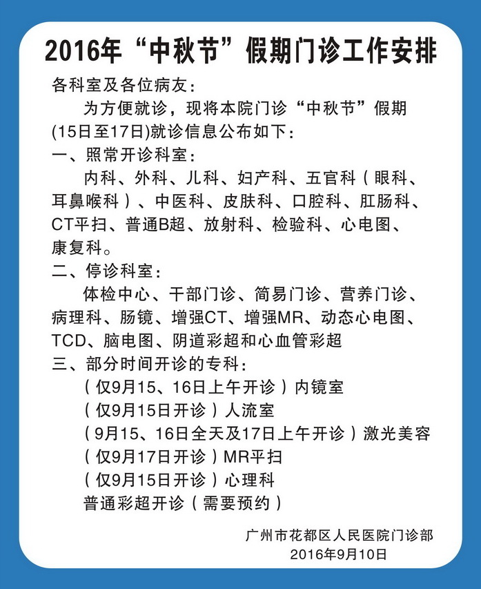 根据国家规定,结合我院实际情况,我院中秋节放假调休三天,从9月15日至9月17日,9月18日正式上班。放假期间门诊部分科室停诊,具体安排如下: