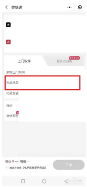 详细输入发件和收件人姓名和地址,选择上门取件,点击物品。