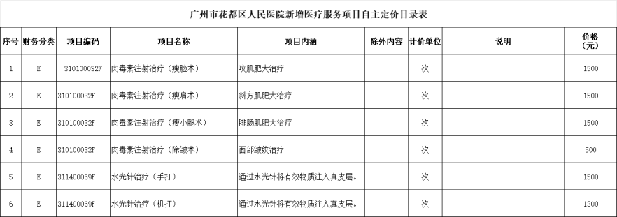 根据《广州地区新增和特需医疗服务价格项目管理办法》(穗医保规字〔2020〕9号)、《广东省市场调节价医疗服务价格项目目录(2021年版)》(粤医保发〔2021〕20号)等文件精神,经医院研究决定,对“肉毒素注射治疗”等医疗服务项目实行自主定价(全自费),收费标准具体见新增医疗服务项目自主定价目录表。