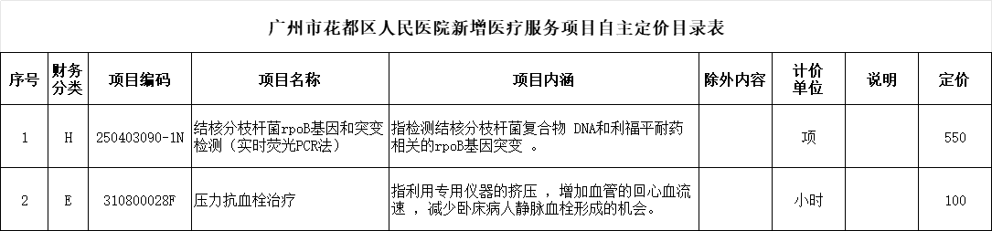 根据《广东省市场调节价医疗服务价格项目目录(2024年12月)》、《广州市医疗保障局转发关于公布“上门服务费”等167项新增医疗服务价格项目的通知 (粤医保发〔2024〕19号)》等文件精神,经医院研究决定,对“压力抗血栓治疗”、“结核分枝杆菌rpoB基因和突变检测(实时荧光PCR法)”2个医疗服务项目实行自主定价(全自费),收费标准具体见广州市花都区人民医院新增医疗服务项目自主定价目录表。 广州市花都区人民医院 2025年3月6日
